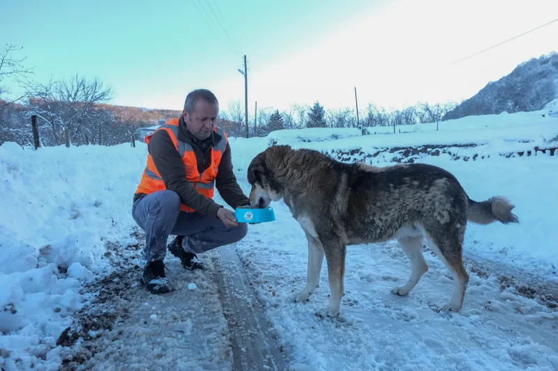 Yoğun kar yağışı altındaki kırsal mahallelerde yiyecek bulmakta zorlanan sokak hayvanları için başlatılan seferberlik kapsamında, belediye ekipleri özel üretim mamaları ulaştırdı.