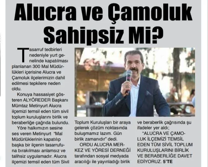 “Mal Müdürlüğü’nün kapanma sürecinde tepki gösteren ilk ve tek sivil toplum kuruluşu biz olduk. İlçemizin hakkını savunmak adına tüm STK’lara çağrıda bulunduk; ancak ne yazık ki çağrımız yeterli karşılığı bulmadı. Buna rağmen, Alucra’nın gidişatına ‘dur’ demek için tek başımıza da olsa sorumluluk aldık ve üzerimize düşeni yapmaya devam ediyoruz. Bu mücadele, kişi veya kurum ayrımı gözetmeden tamamen ilçemizin geleceği içindir. Aynı kararlılıkla çalışmayı sürdüreceğiz.”.
