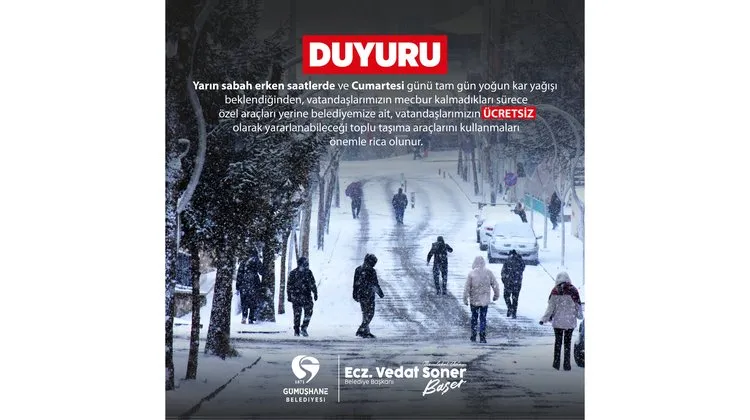 Gümüşhane Belediyesi, bir duyuru yayımladı.